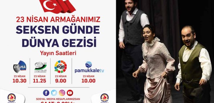 Denizli Büyükşehir Belediyesi Şehir Tiyatrosu, 23 Nisan Ulusal Egemenlik ve Çocuk Bayramı dolayısıyla “Seksen Günde Dünya Gezisi” adlı çocuk oyununu sahneye taşıdı. Oyun, 23 Nisan sabahı Denizli Büyükşehir Belediyesinin sosyal medya hesapları ile yerel TV’lerden yayınlanacak. Türkiye Büyük Millet Meclisi’nin (TBMM) kuruluşunun 100. yıldönümü ve 23 Nisan Ulusal Egemenlik ve Çocuk Bayramı etkinlikleri kapsamında çocuklar için özel bir program hazırlayan Denizli Büyükşehir Belediyesi Şehir Tiyatrosu, Jules Verne’nin dünyaca ünlü “80 günde devri alem” romanını sahneye taşıdı. Denizli Büyükşehir Belediyesi Basın Yayın ve Halkla İlişkiler Dairesi tarafından kayda alınan “Seksen Günde Dünya Gezisi” adlı çocuk oyunu 23 Nisan sabahı 09.00’dan itibaren Denizli Büyükşehir Belediyesinin youtube ve sosyal medya hesaplarından (facebook, twitter ve instagram) yayınlanacak.