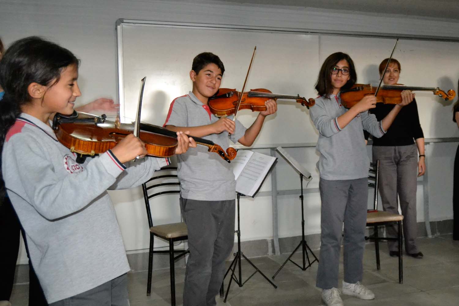 Vivaldi’nin Dört Mevsim adlı eseriyle konsere başlayan Anadolu Yaylı Çalgılar Topluluğu, seslendirdikleri Beethoven gibi ünlü sanatçılarının eserlerinin yanı sıra “Daha Dün Annemizin Kolları’nda Yaşarken”,  Aşık Veysel’in “Uzun İnce Bir Yoldayım” eseri de dinleyenleri mest etti.    Kadıköy İlk ve Ortaokul’daki etkinliklerini,  İzmir Marşı ile sonlandıran Anadolu Yaylı Çalgılar Topluluğu,  hiç eline almamış olmasına rağmen keman, viyola, viyolonsel çalmayı hayal eden öğrenciler ile öğretmenleri sahneye davet etti.  Keman, viyola ve viyolonseli ilk kez dokunan ve çalmaya çalışan öğrenciler sahnede unutulmaz anlar yaşadı.