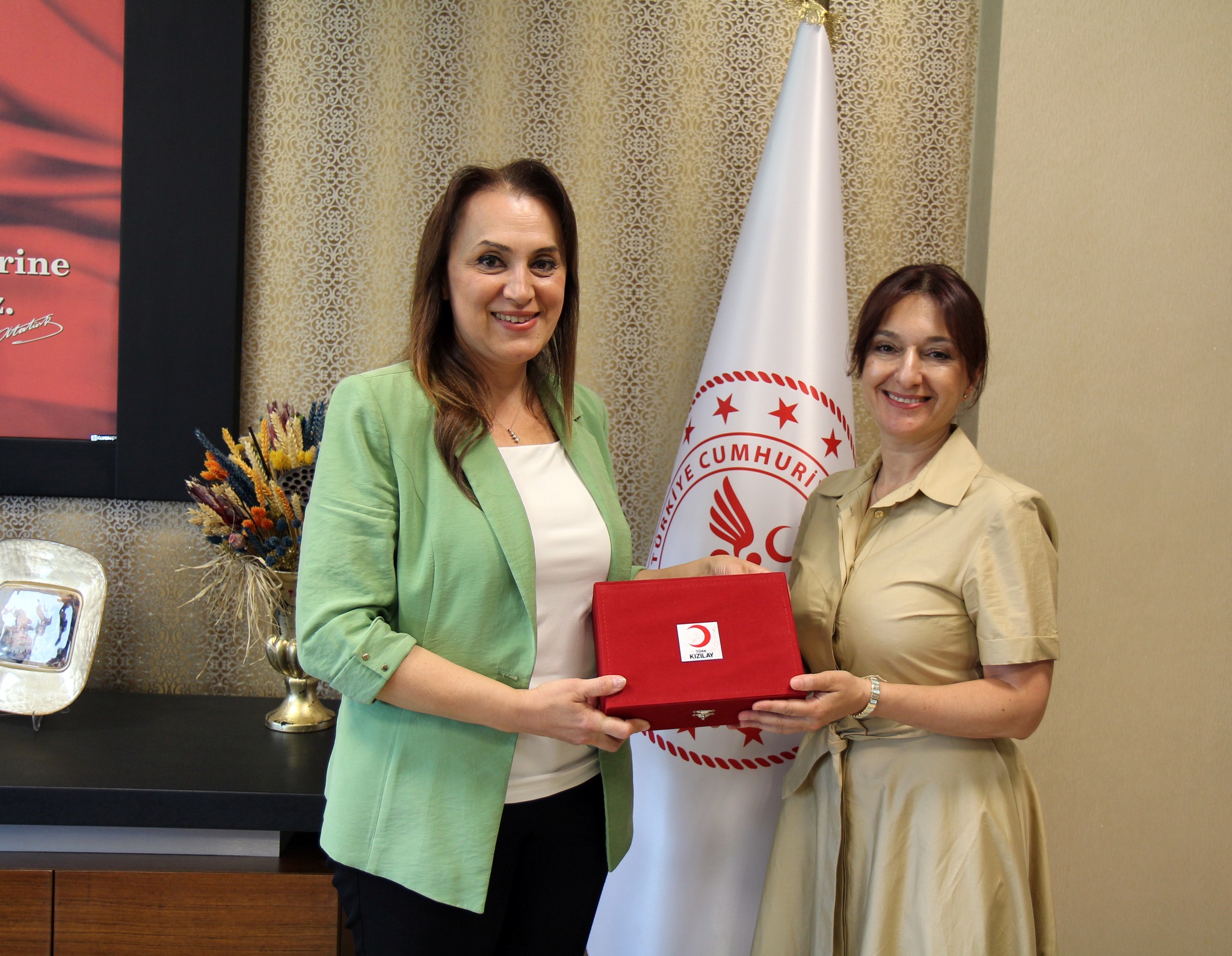 Türk Kızılay Denizli İl Başkanı Pınar Gökçe ve yönetim kurulu üyeleri, Denizli İl Sağlık Müdürü Uz. Dr. Berna Öztürk’ü ziyaret etti. Kızılay’ın çalışmaları hakkında bilgi alışverişinin yapıldığı ziyarette; İl Sağlık Müdürü Öztürk, Kızılay gönüllü formunu imzaladı ve Kızılay gönüllüsü oldu. Başkan Gökçe tarafından Öztürk’e gönüllü forması ve hediye takdimi yapıldı.