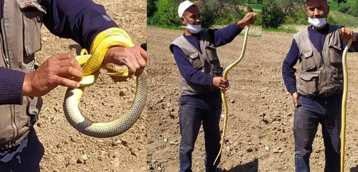 Denizli’nin Çameli ilçesinde bir çiftçi tarlada çıplak elle yakaladığı yılanla ilk önce oynadı sonra doğaya saldı! 43 yaşındaki çiftçi Yıldıray Sert, tütün tarlasında traktöre giren yılanı çıplak elle yakaladı. Olay, Çameli ilçesi Kalınkoz Mahallesi’nde meydana geldi. Yıldıray Sert, tütün tarlasında traktöre giren yılan olduğunu fark edince, çıplak eliyle hayvanı yakaladı. Daha sonra elinde yılanı dışarı çıkaran Sert, hayvanla bir süre oynadı. Çevredekiler şaşkınlık yaşarken, Sert 1,5 metre uzunluğundaki “bozyürük” türü yılanı bir süre sonra doğaya saldı. Sert’in yılanla oynadığı anlar ise cep telefonu kamerasıyla kaydedildi.